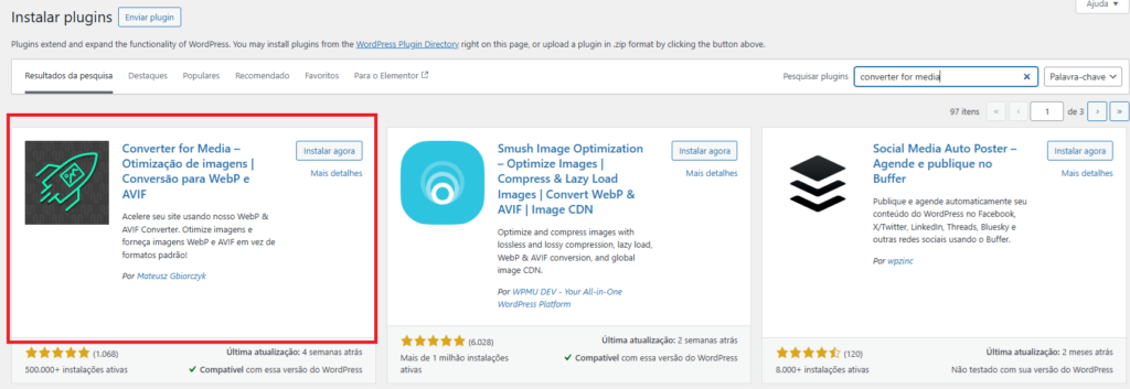 1- Acesse o painel de plugins e pesquise Converter for Media. Instale e ative;