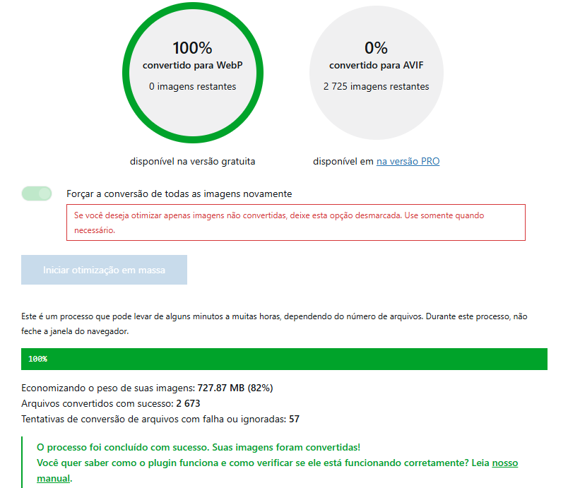 2 – Vá nas configurações do plugin, role a página até o fim. Clique em “Iniciar otimização em massa” e selecione a caixa “Forçar a conversão de todas as imagens novamente”. Ignore todos os aviso e solicitação de Tokens (É apenas propaganda).