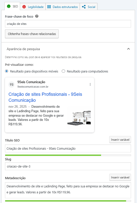 Agora é só editar o Título, Slug e Metadescrição. Mas sempre pense nos termos de pesquisa ou em algum diferencial que sua empresa proporciona.